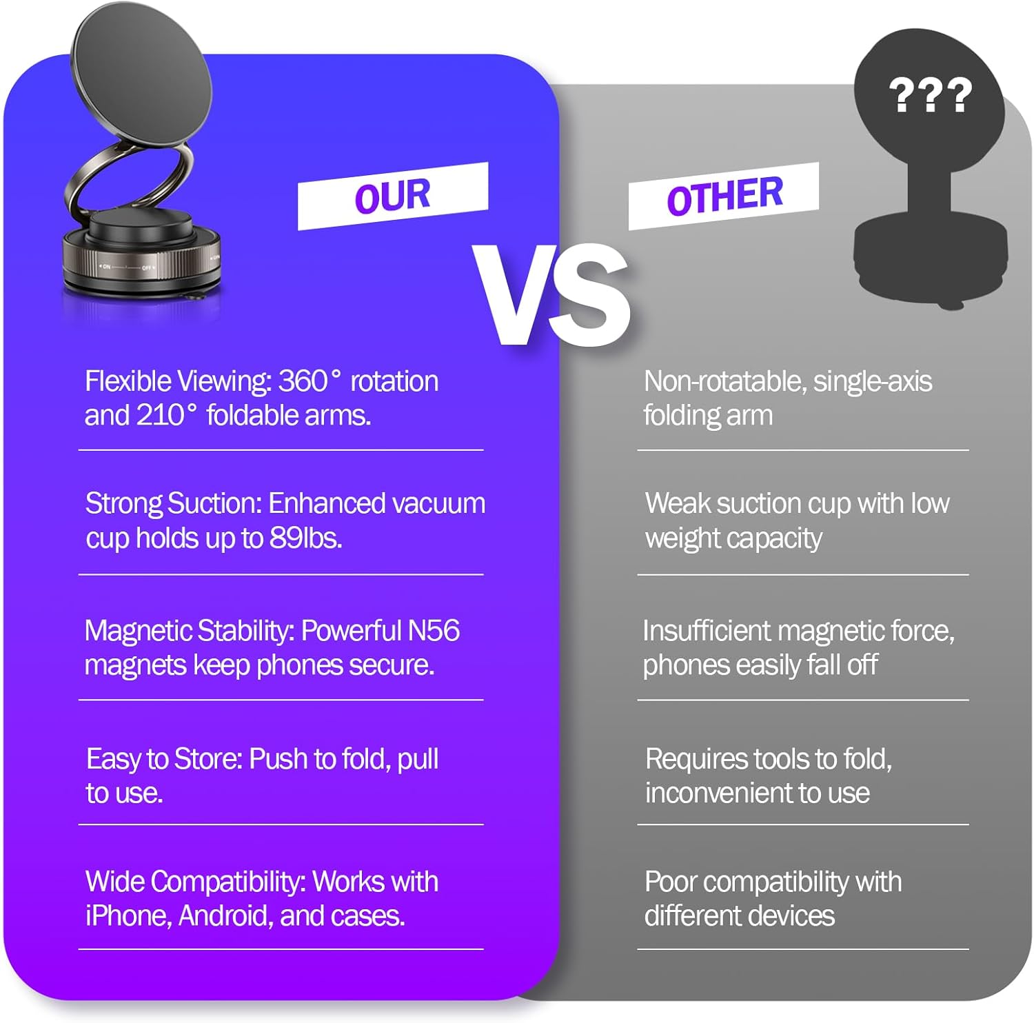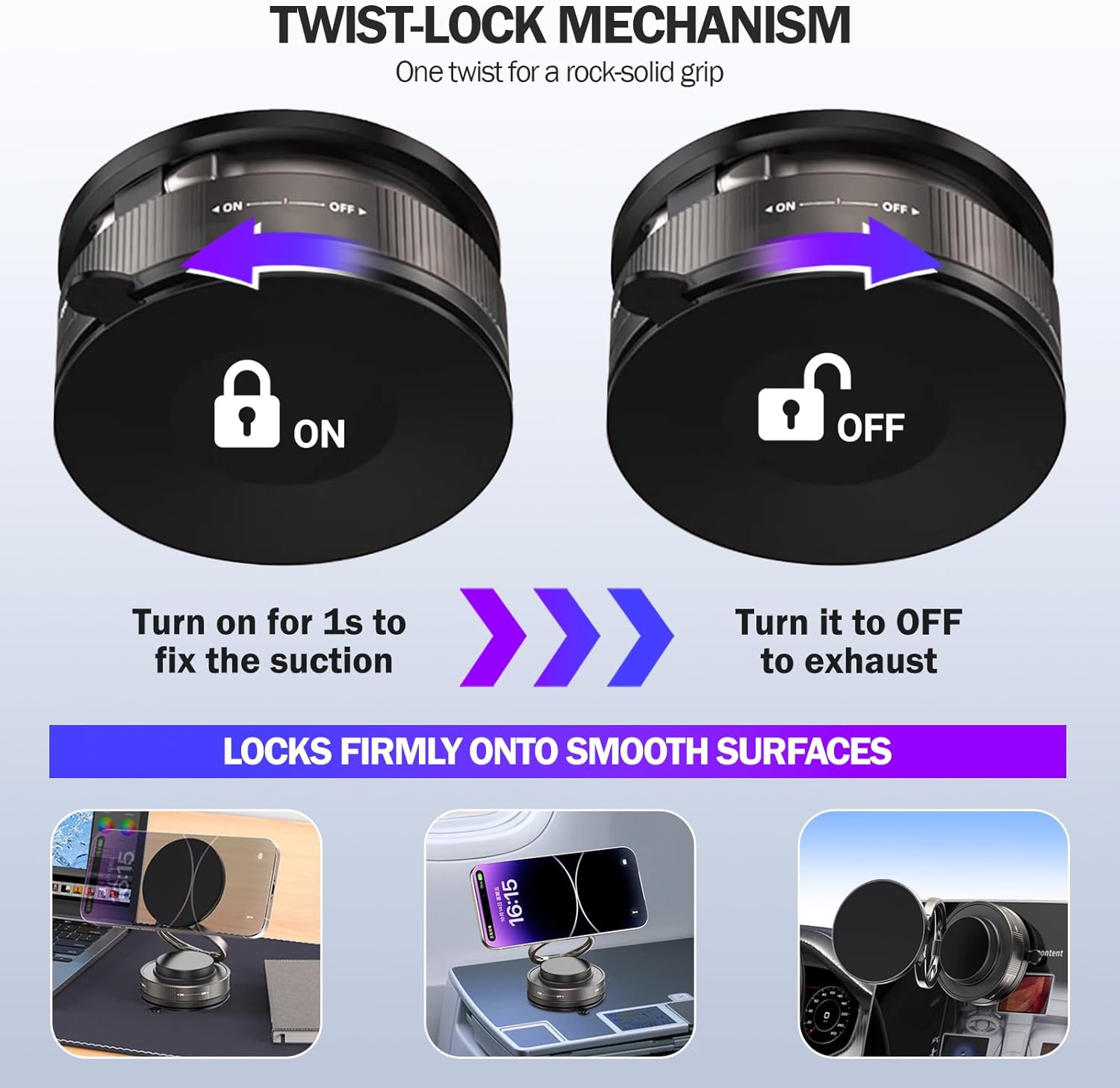 Security: Experience the power of advanced magnetic technology with our vacuum magnetic phone holder. Engineered for a rock-solid grip, it keeps your phone securely in place, even on bumpy rides or during intense use. No more worries about drops or slips—just reliable performance you can trust This MagHold 360 suction phone holder is compact, lightweight, and travel-friendly. Slip it into your bag or pocket effortlessly—it’s the perfect companion for daily commutes, road trips, or workdays without adding bulk|