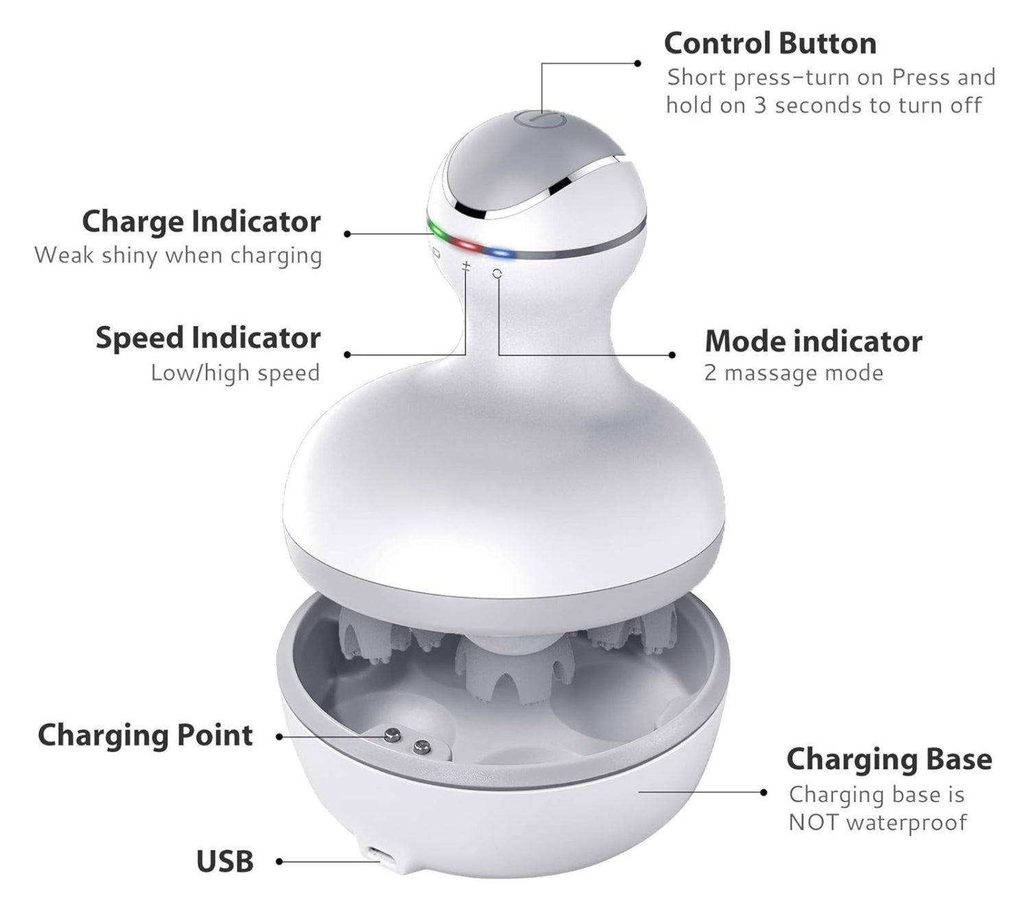 4 massager heads with 28 individual 3D Deep-Kneading, perfectly fit the scalp, hand-simulation, deep and fully massage head. Increase blood circulation to the scalp, boosting hair growth, promoting relaxation, releasing stress and relieving sore.